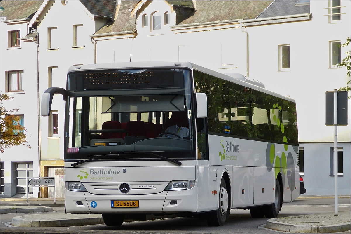 . SL 5506, Mercedes Benz Integro, von Voyages Bartholme, (Sales Lentz group), wartet an der Bushaltestelle in Clervaux am Bahnhof auf Fahrgäste. 25.09.2015