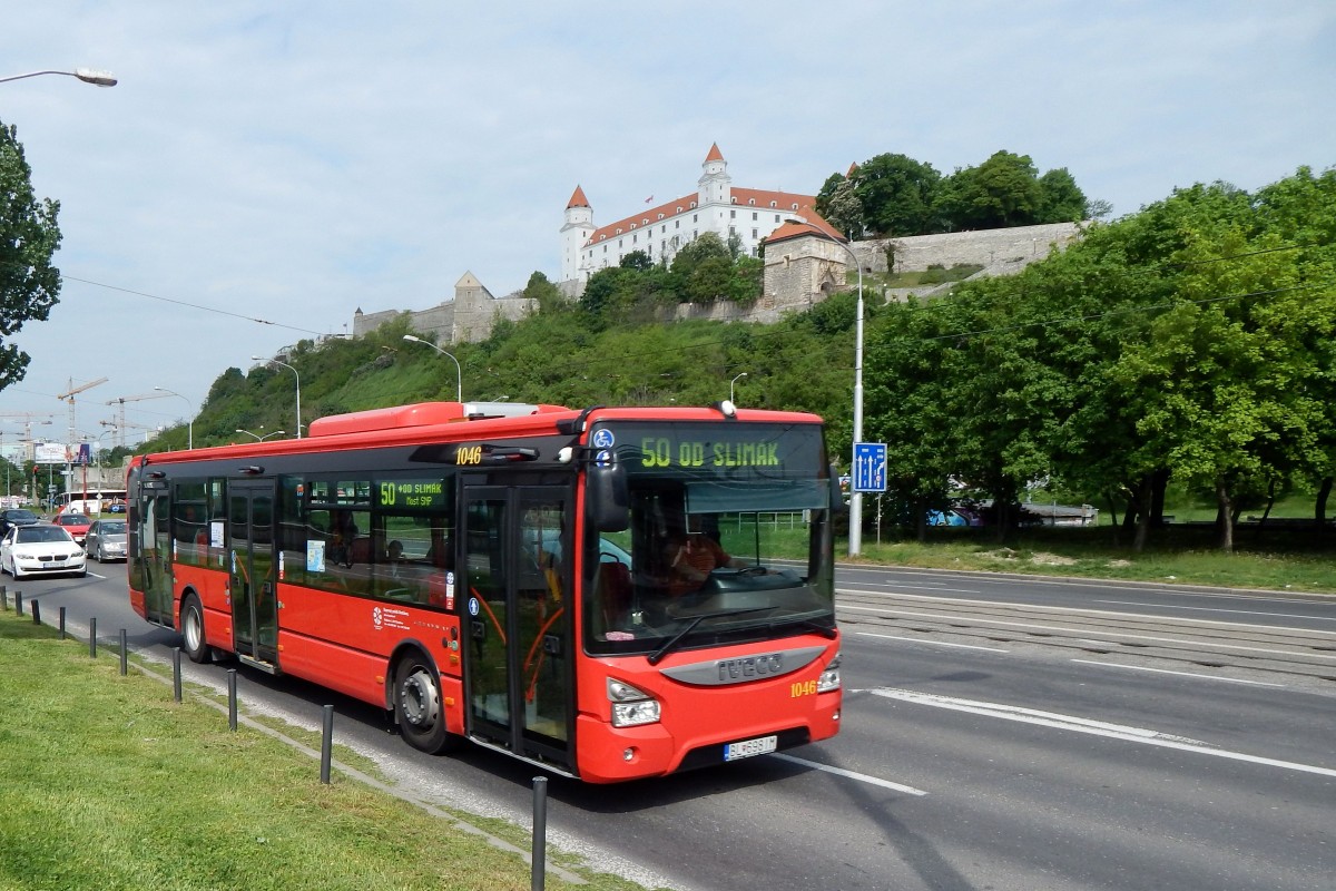 Slowakei / Stadtbus Bratislava: Iveco Urbanway 12M - Wagen 1046, aufgenommen im Mai 2015 an der Haltestelle "Most SNP" in Bratislava.