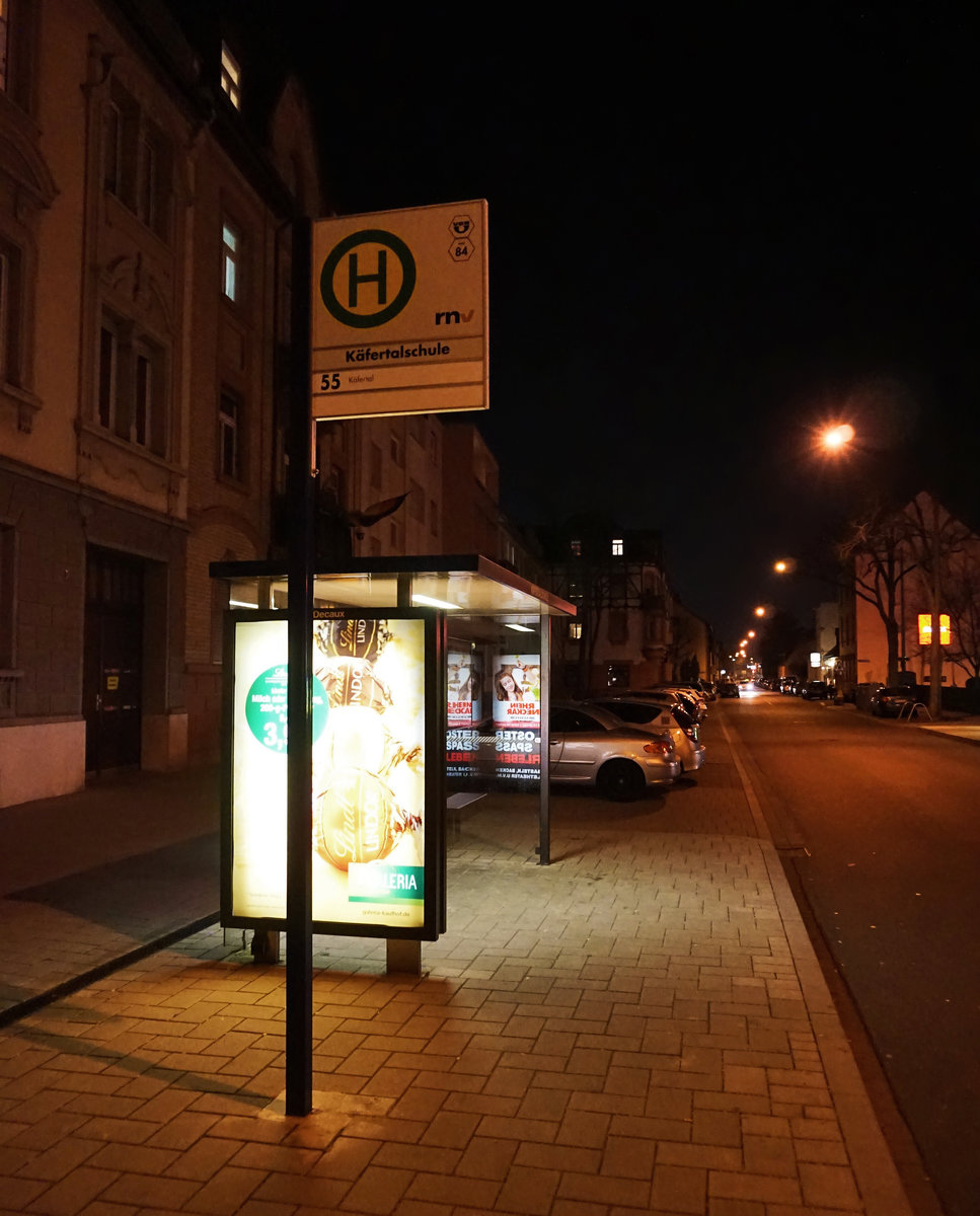 Blick auf die Haltestelle Käfertal Käfertalschule am 18.3.2016. Diese wird von der Linie 55 sowie an Sonn- und Feiertagen zusätzlich durch die Linie 55E bedient.