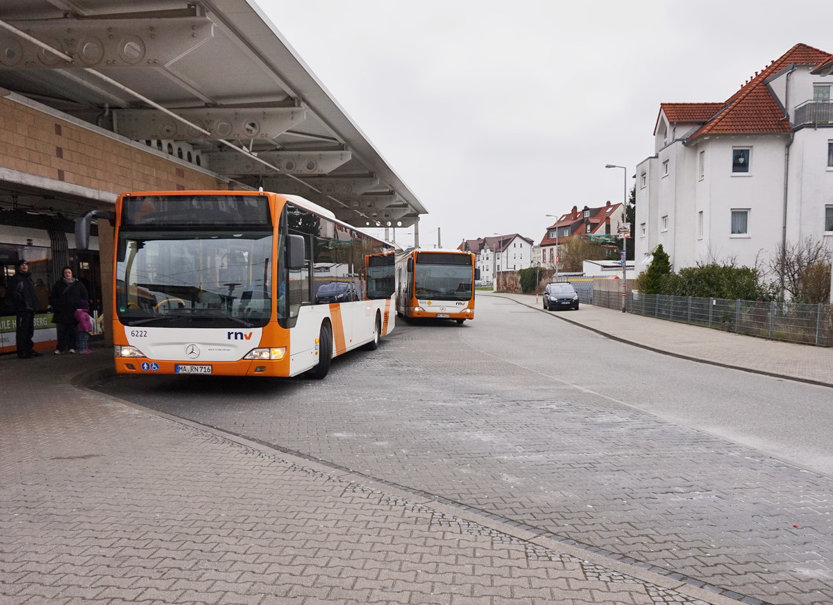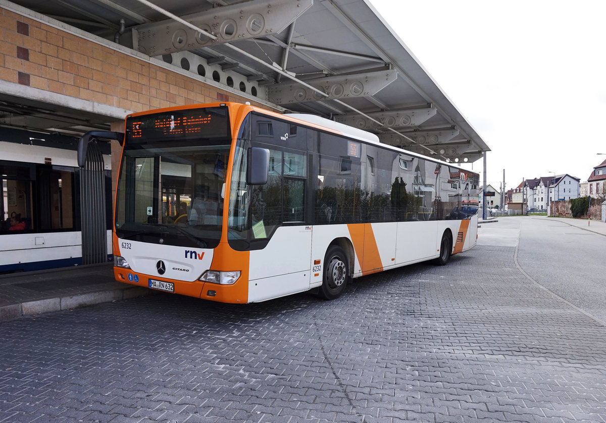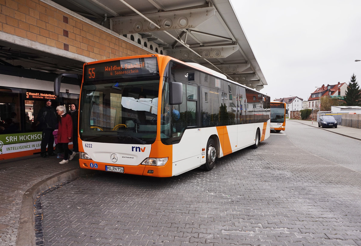 Mercedes-Benz O 530 II (Nr. 6222) der rnv, unterwegs als Linie 55 (Käfertal Bahnhof - Waldhof Bahnhof), am 19.3.2016 bei der Haltestelle Käfertal Bahnhof.