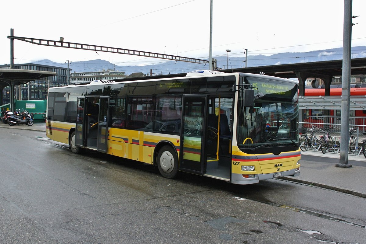BLS Bahnersatz Solothurn - Biberist - Gerlafingen - Wiler - Utzenstorf - Aefligen - Kirchberg-Alchenflüh wegen Bauaurbeiten; Zum Einsatz kamen 2 BSU Citaro C2, 2 BLS Citaro C2 und ein STI Man: STI MAN Nr. 127 beim Bahnhof Solothurn, 15.04.2016.