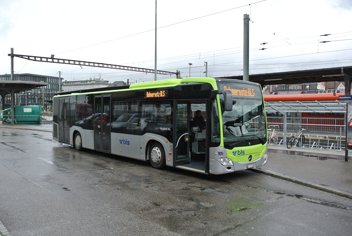 BLS Bahnersatz Solothurn - Biberist - Gerlafingen - Wiler - Utzenstorf - Aefligen - Kirchberg-Alchenflüh wegen Bauaurbeiten; Zum Einsatz kamen 2 BSU Citaro C2, 2 BLS Citaro C2 und ein STI Man: BLS Citaro C2 Nr. 105 beim Bahnhof Solothurn, 23.04.2016.