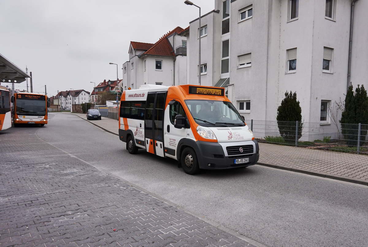 Fiat Ducato von S&F TOURS, in der Lackierung der rnv, am 19.3.2016 bei einer Betriebsfahrt bei der Haltestelle Käfertal Bahnhof.