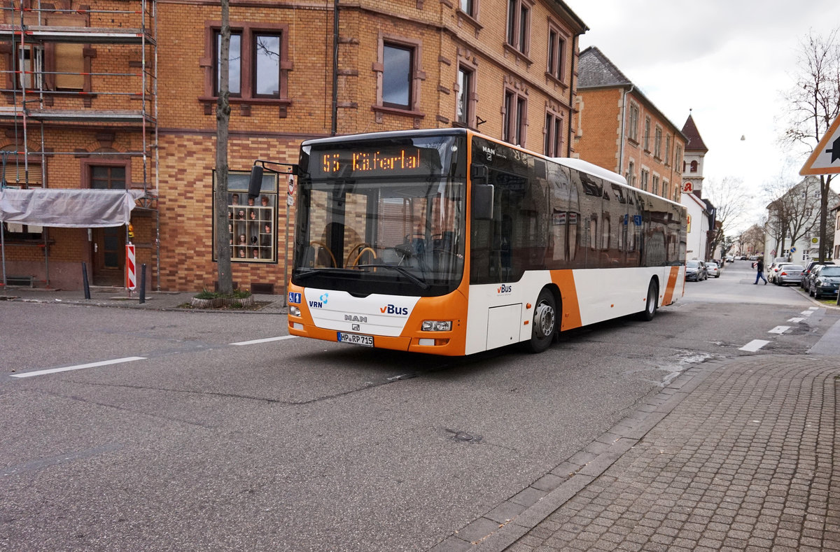 MAN Lion's City von vBUS, unterwegs als Linie 55 (Waldhof Haus Waldhof - Käfertal Bahnhof), am 27.3.2016 nahe der Haltestelle Käfertal Rathaus.