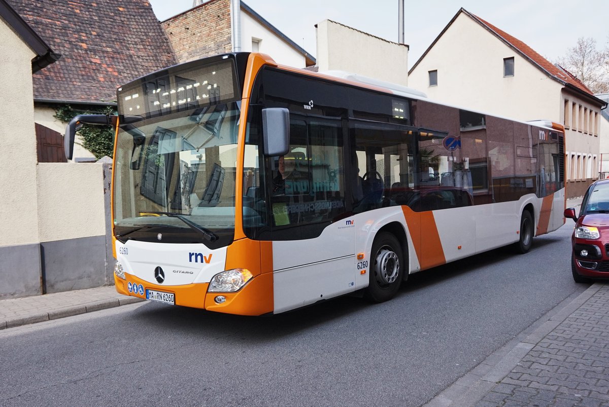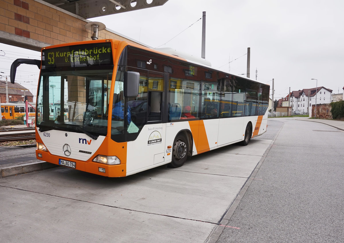 Mercedes-Benz O 530 I (Nr. 6230) der rnv, unterwegs als Linie 53 (Käfertal Mannheimer Straße - Käfertal Bahnhof - Luzenberg - Mannheim Kurpfalzbrück), am 19.3.2016 bei der Haltestelle Käfertal Bahnhof.