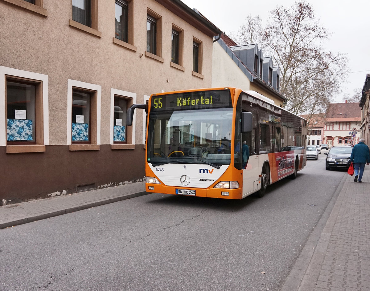 Mercedes-Benz O 530 I (Nr. 6243) der rnv, unterwegs als Linie 55 (Waldhof Haus Waldhof - Käfertal Bahnhof), am 19.3.2016 nahe der Haltestelle Käfertal Rathaus.