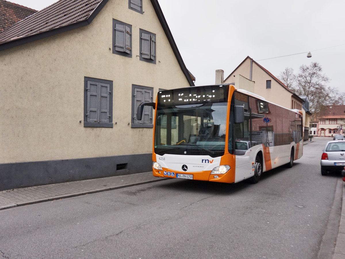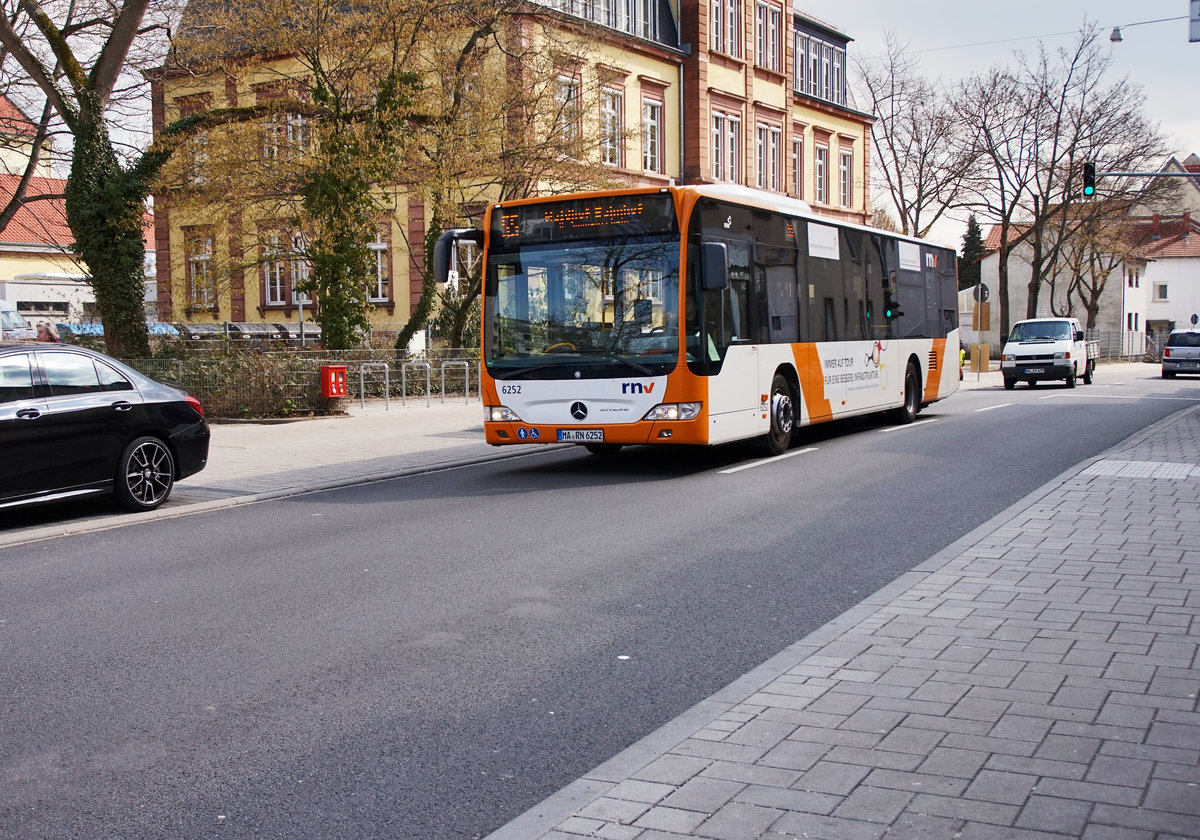 Mercedes-Benz O 530 III (Nr. 6258) der rnv, unterwegs als Linie 54 (Vogelstang real - Käfertal Bahnhof - Vogelstang, real), am 19.3.2016 nahe der Haltestelle Käfertal Rathaus.