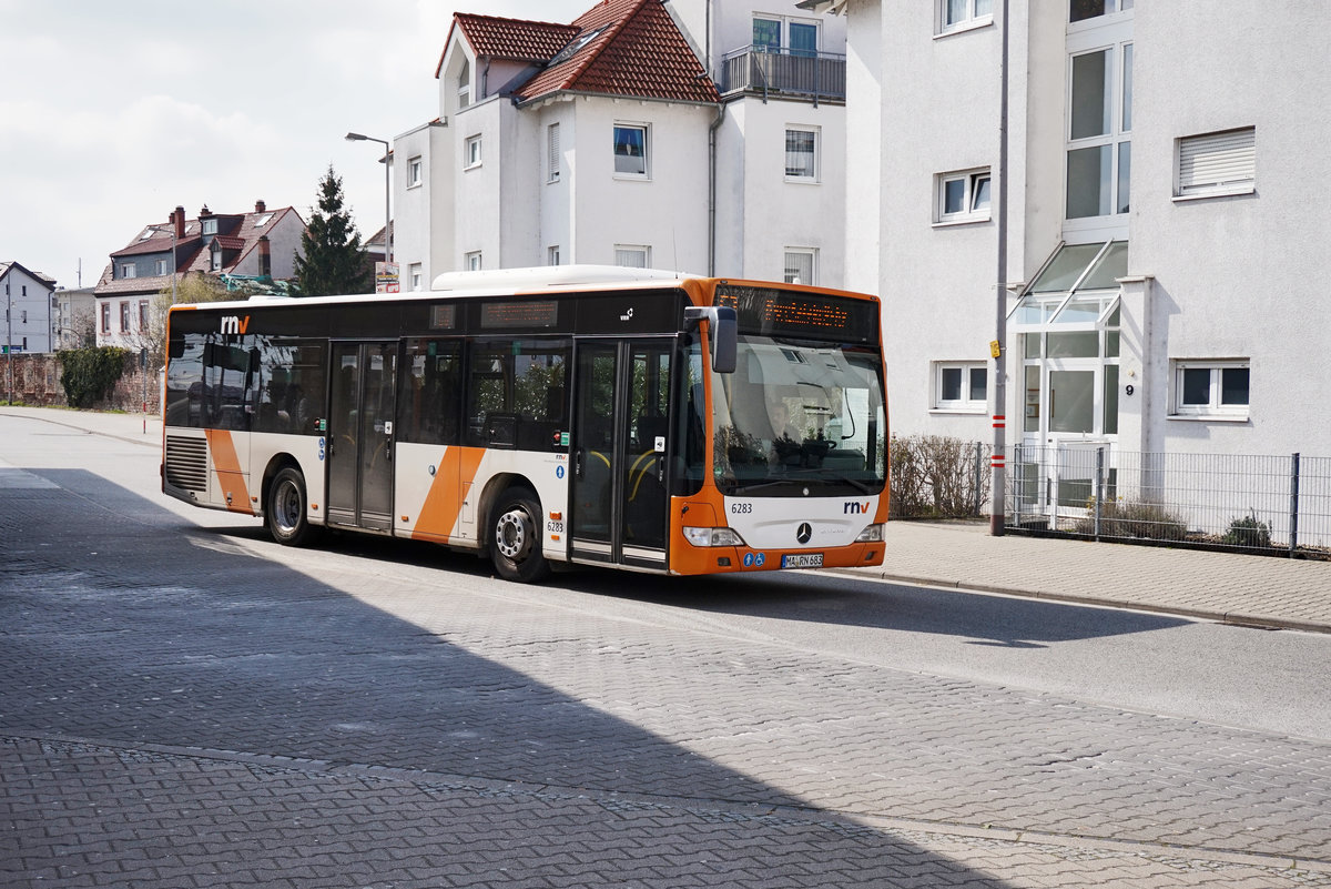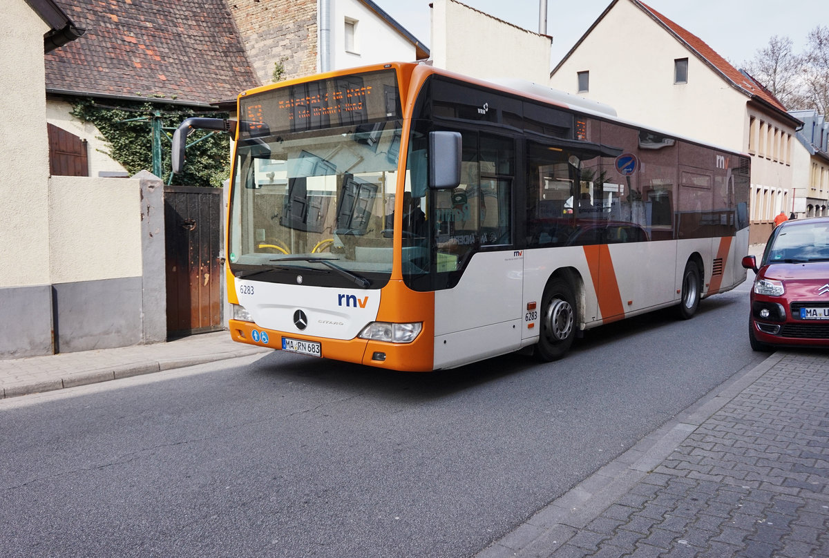 Mercedes-Benz O 530 II (Nr. 6283) der rnv, unterwegs als Linie 53 (Käfertal Mannheimer Straße - Käfertal Bahnhof - Luzenberg - Mannheim Kurpfalzbrück), am 24.3.2016 bei der Abfahrt aus der Haltestelle Käfertal Bahnhof.