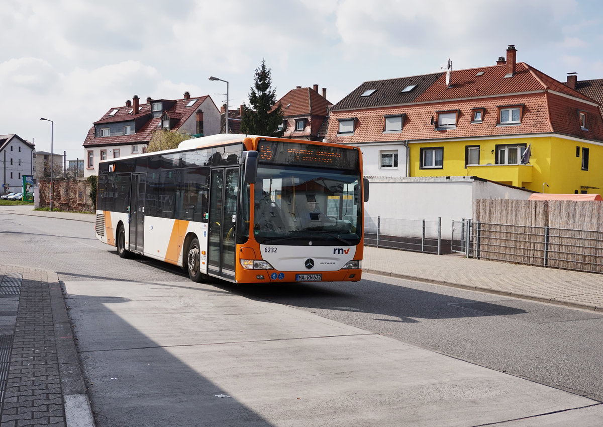 Mercedes-Benz O 530 II (Nr. 6232) der rnv, unterwegs als Linie 55 (Käfertal Bahnhof - Waldhof Bahnhof), am 24.3.2016 bei der Einfahrt in die Haltestelle Käfertal Bahnhof.