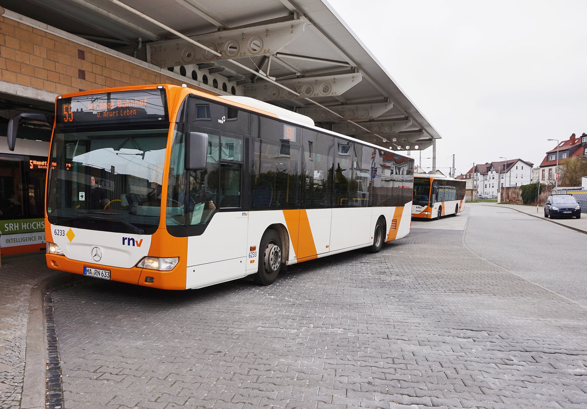 Mercedes-Benz O 530 II (Nr. 6233) der rnv, unterwegs als Linie 55 (Käfertal Bahnhof - Waldhof Bahnhof), am 19.3.2016 bei der Haltestelle Käfertal Bahnhof.