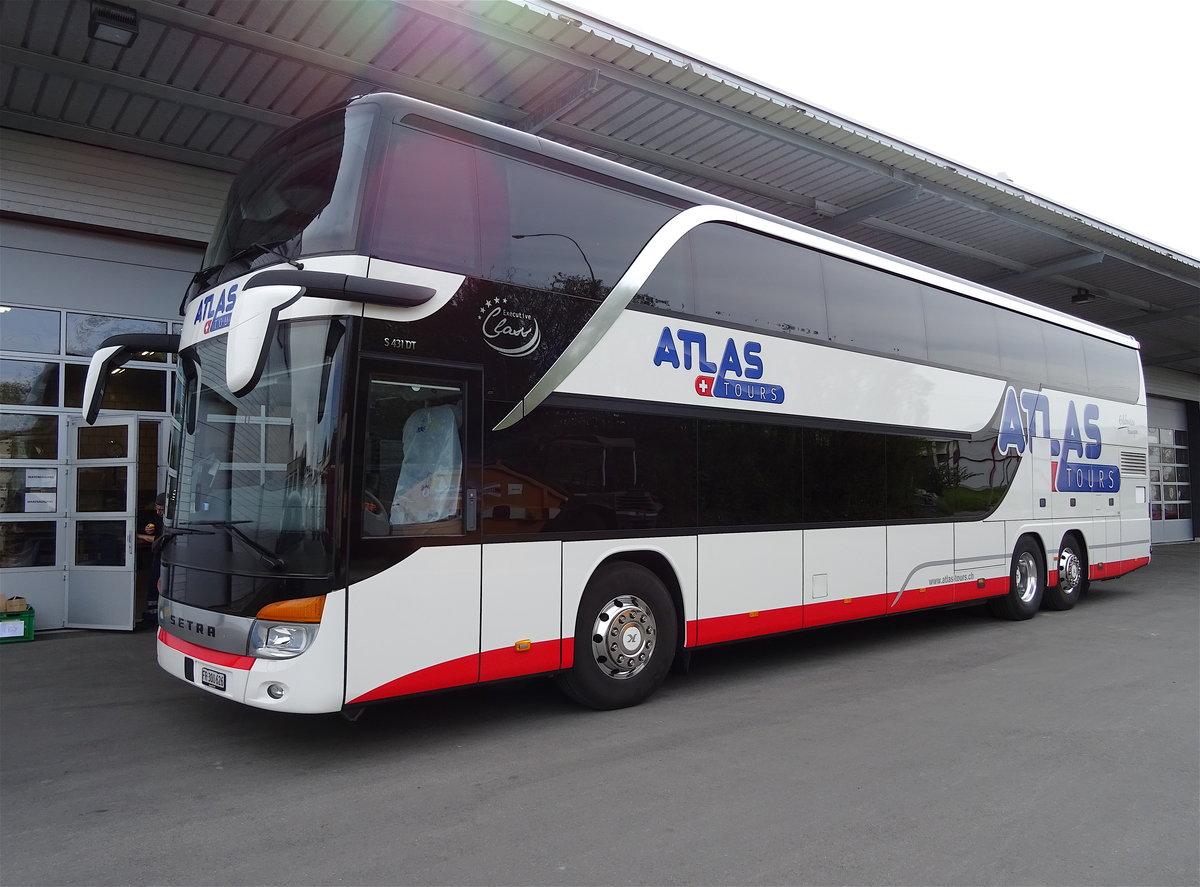 Setra 416 HDH, véhicule acquis récemment par Jürg Mpser AG ici à la sortie de l'atelier de peinture chez Remund AG, avril 2016