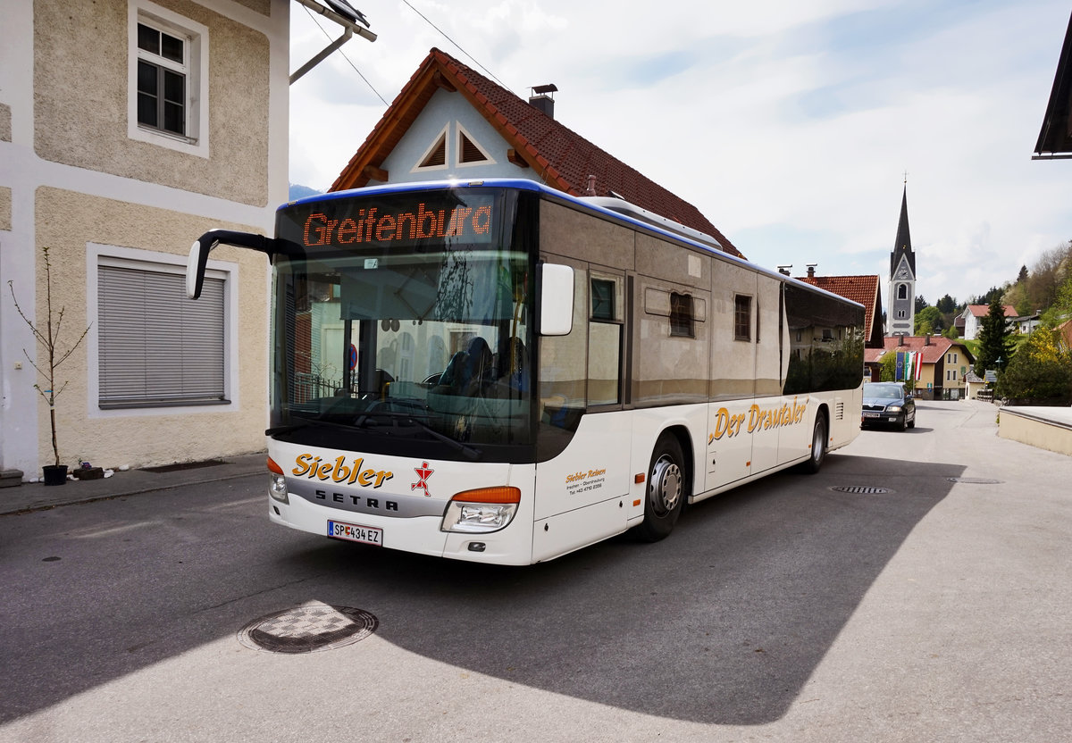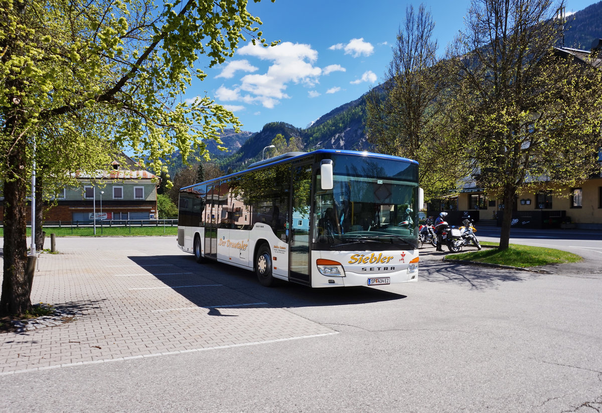 Setra S 415 NF von Siebler Reisen unterwegs auf der Kfl. 5021 als Kurs 11 (Oberdrauburg Bahnhof - Gerlamoos), am 20.4.2016 in Dellach im Drautal.