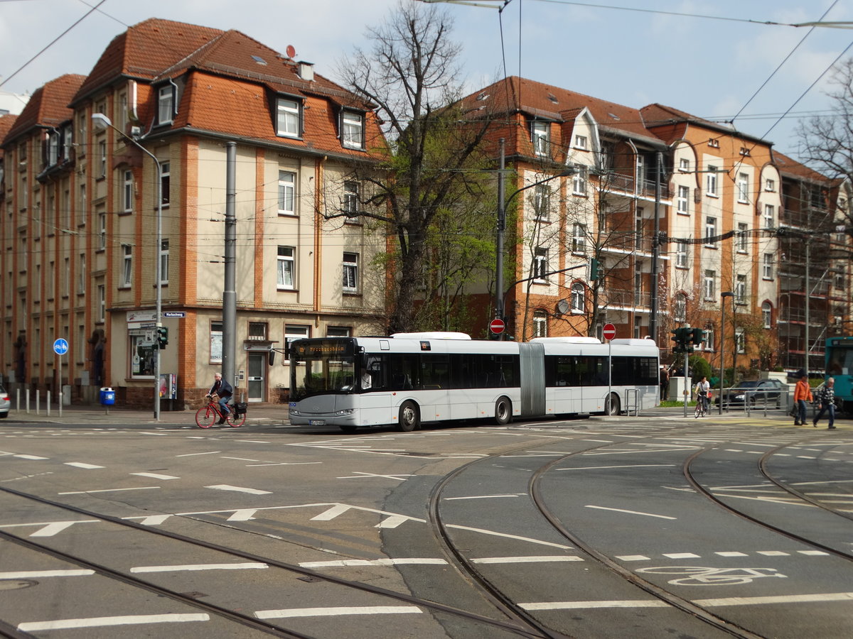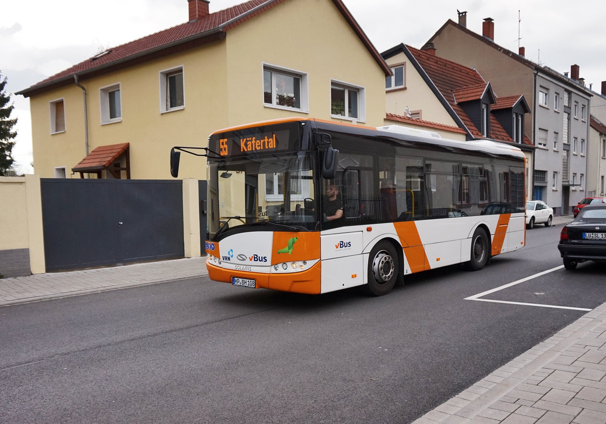SOLARIS Urbino 8,9 von vBUS, unterwegs als Linie 55 (Waldhof Haus Waldhof - Käfertal Bahnhof), am 27.3.2016 nahe der Haltestelle Käfertal Äußere Wingertstraße.
