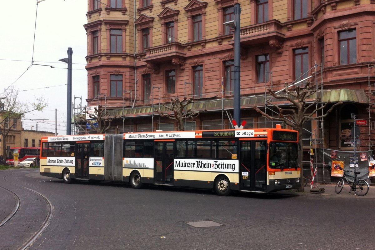 Stadtbus Mainz: Mercedes-Benz O 405 G der MVG Mainz / Mainzer Verkehrsgesellschaft, aufgenommen im April 2016 am Hauptbahnhof in Mainz.