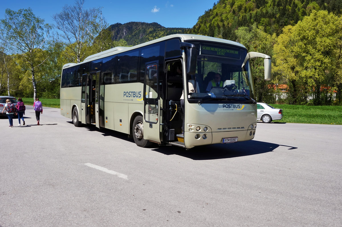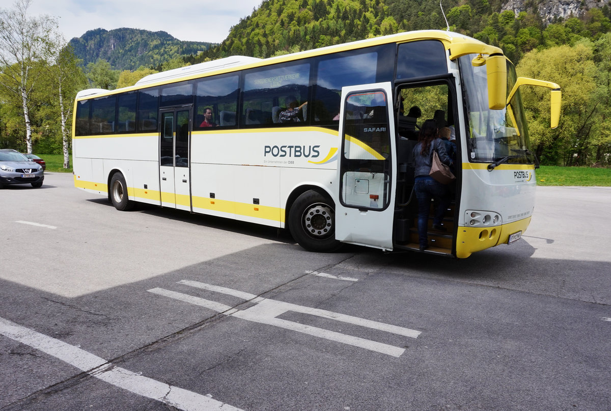 Temsa Safari von POSTBUS, unterwegs als SEV-Kurs 14223 (Greifenburg-Weißensee Bahnhof - Lienz Bahnhof), am 22.4.2016 beim Halt an der Haltestelle Oberdrauburg Bahnhof.