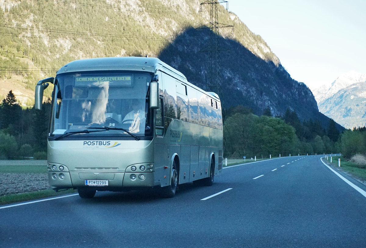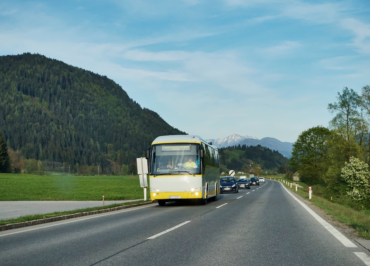 Temsa Safari von POSTBUS unterwegs als SEV-Kurs 14241 (Greifenburg-Weißensee Bahnhof - Lienz Bahnhof), am 14.4.2016 kurz vor der Haltestelle Berg im Drautal Bahnhof.