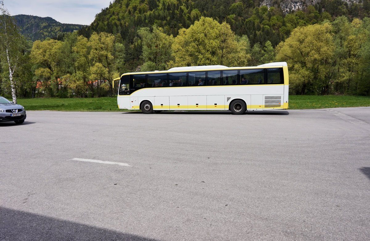 Temsa Safari von POSTBUS, unterwegs als SEV-Kurs 14223 (Greifenburg-Weißensee Bahnhof - Lienz Bahnhof), am 22.4.2016 nach einer Wende bei der Haltestelle Oberdrauburg Bahnhof.