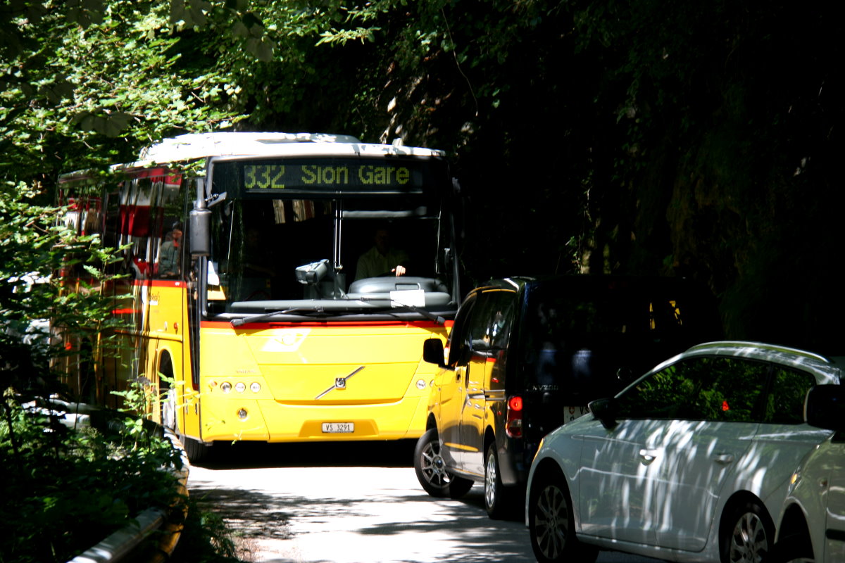 Auf der schmalen Straße zur Derborence gab es heute auf dem Mittagskurs ein ziemliches Chaos. Die Verspätung am Bahnhof Sion: 20 Minuten durch rücksichtslose Verkehrsteilnehmer! Ein Volvo 8700 Postauto auf der Linie 12.332 Deborence - Aven - Sion; 06.08.2016