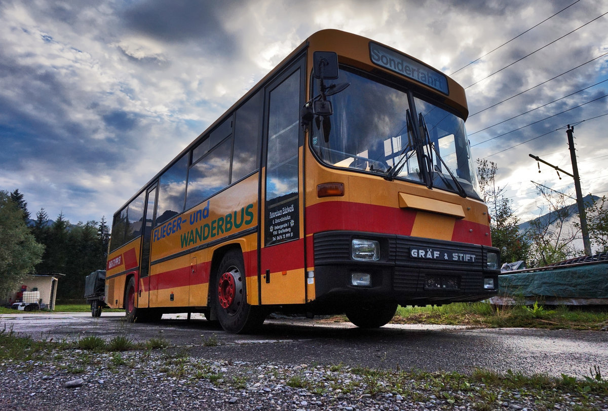 Nach einer regnerischen Nacht spiegelt sich der Volvo B10-400 von Autoreisen Edelweiß, in einer der noch übrig geblieben Pfützen.
