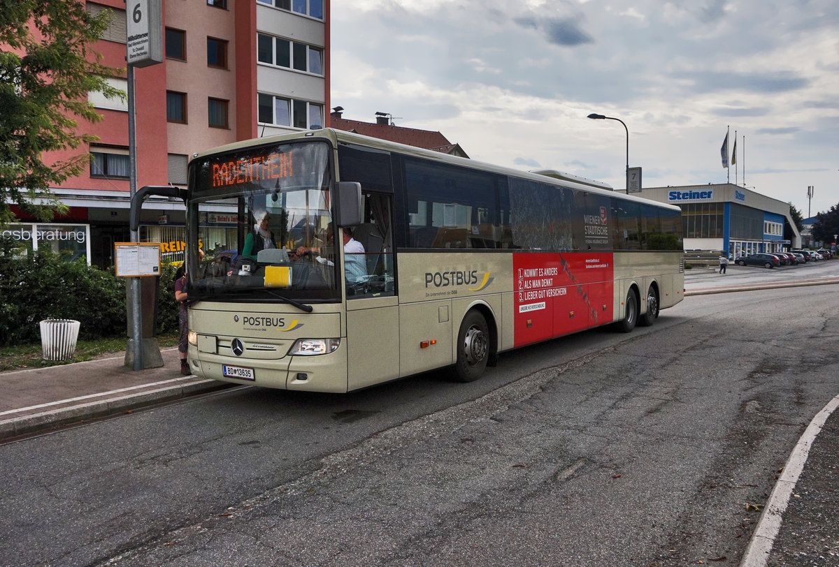 Ein für die Wiener Städtische werbender Mercedes-Benz Integro von POSTBUS, fährt in die Haltestelle Spittal-Millstättersee Bf/Bbf ein.