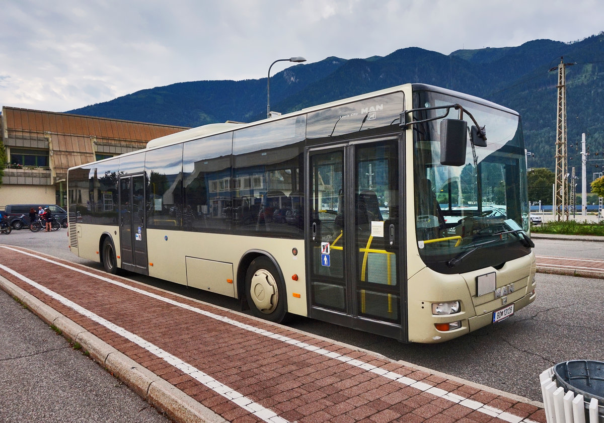 Ein MAN Lion´s City von POSTBUS, steht am 5.8.2016 an der Haltestelle Spittal-Millstättersee Bf/Bbf.