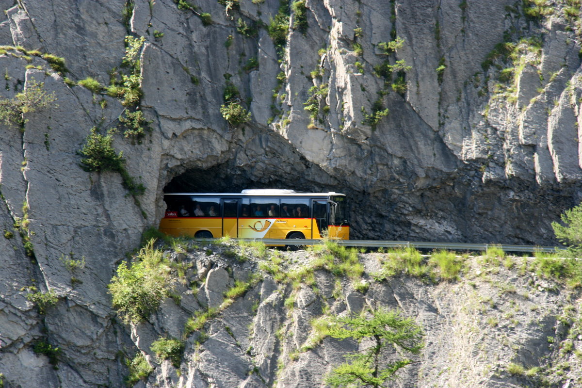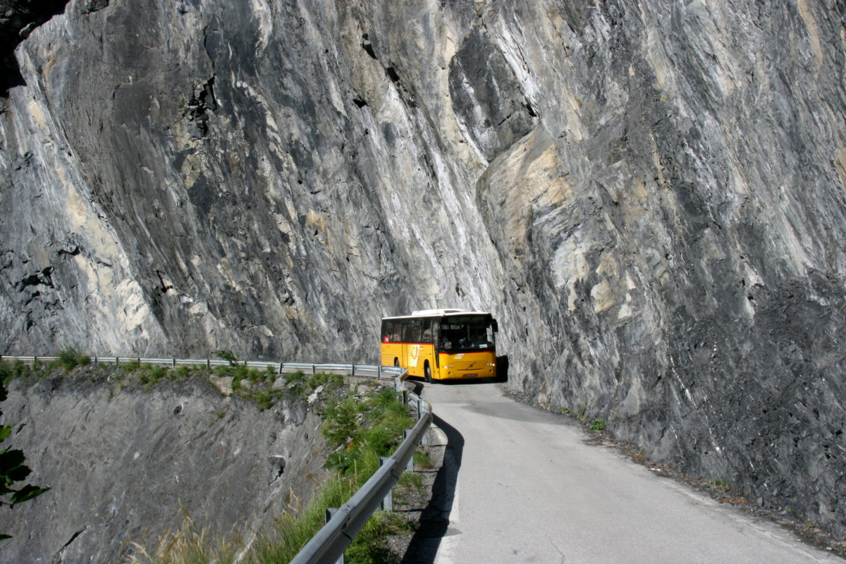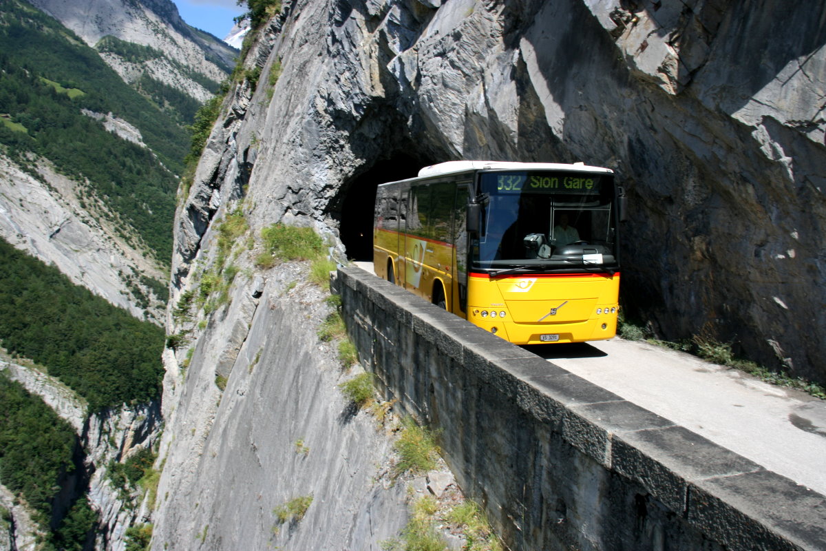 Ein Volvo 8700 Postauto auf dem Kurs 12.332 Deborence - Aven - Sion in der Tunnelstrcke an der Steilkannte über dem Val di Lizerne; 06.08.2016