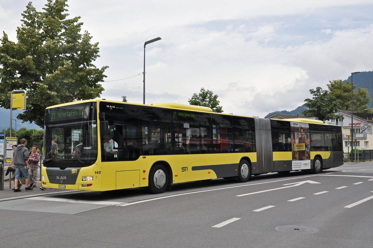 Mercedes Citaro 145, auf der Linie 21, wartet an der Haltestelle beim Bahnhof Interlaken West. Die Aufnahme stammt vom 23.07.2016.
