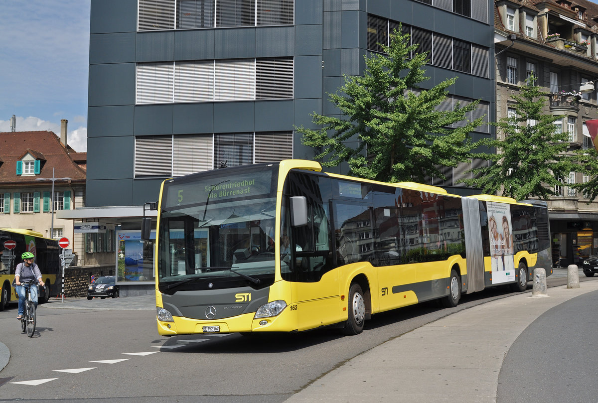 Mercedes Citaro 162, auf der Linie 5 fährt zur Haltestelle beim Bahnhof Thun. Die Aufnahme stammt vom 28.07.2016.