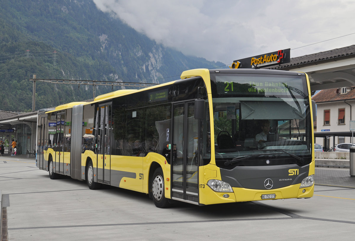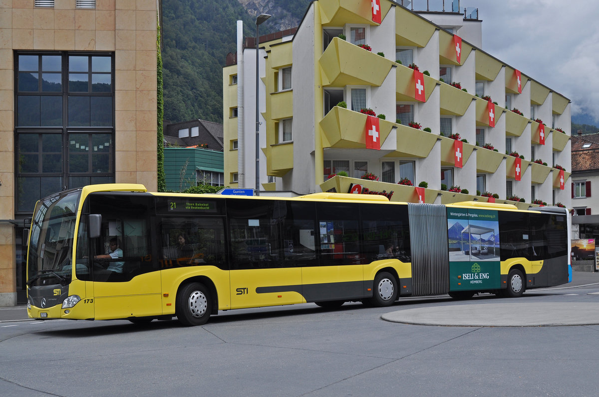 Mercedes Citaro 173, auf der Linie 21, verlässt die Haltestelle beim Bahnhof Interlaken West. Die Aufnahme stammt vom 23.07.2016.