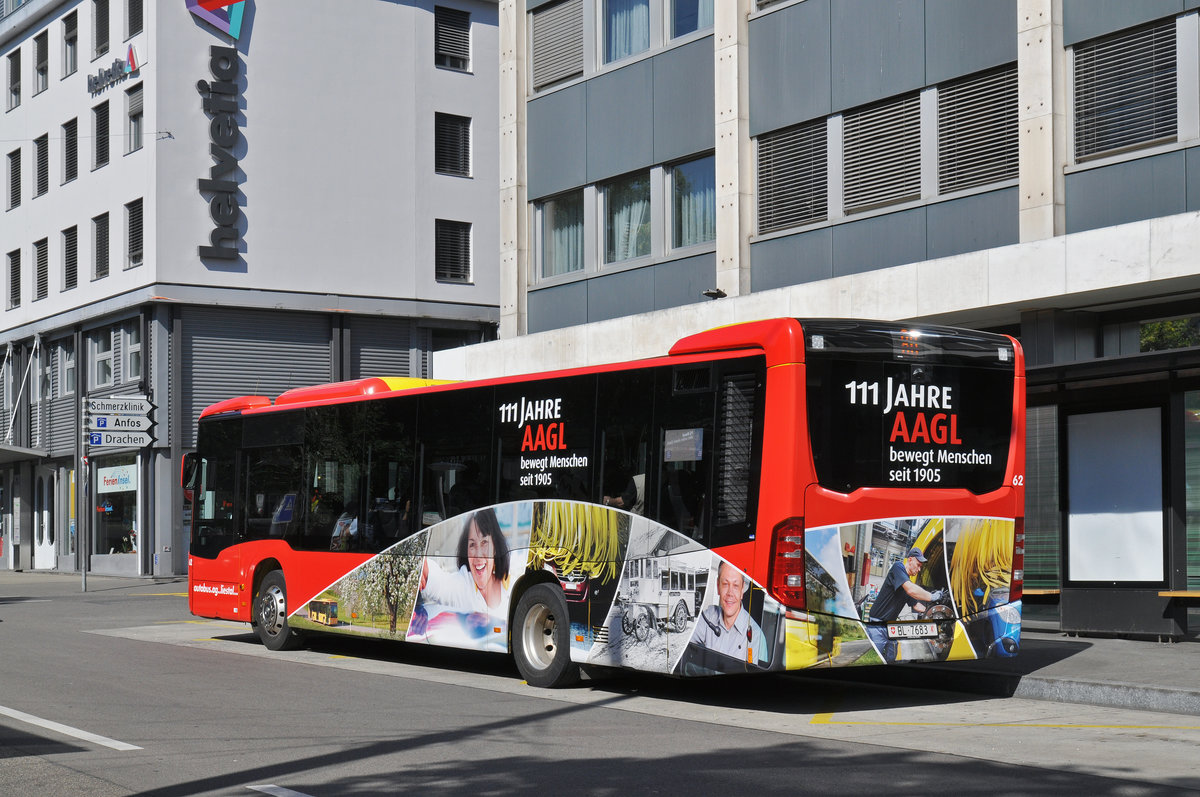 Mercedes Citaro Nr. 62 der AAGL, auf der Linie 80, wartet an der Endstation am Aeschenplatz. Die Aufnahme stammt vom 15.07.2016.