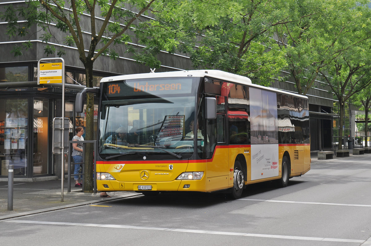 Mercedes Citaro der Post, auf der Linie 104, bedient die Haltestelle beim Bahnhof Interlaken West. Die Aufnahme stammt vom 23.07.2016.