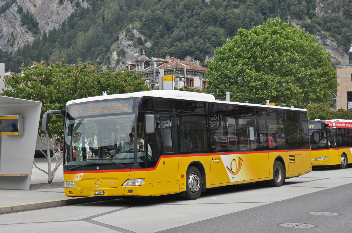 Mercedes Citaro der Post, auf der Linie 101, bedient die Haltestelle beim Bahnhof Interlaken West. Die Aufnahme stammt vom 23.07.2016.