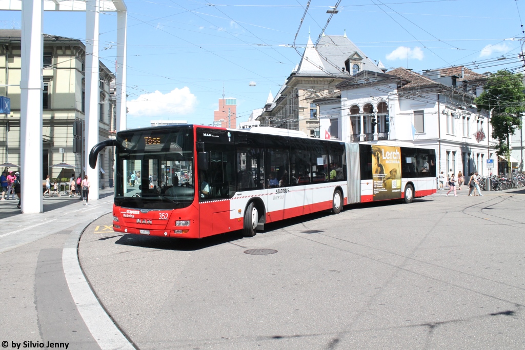 Postauto/Regie ZH-Unterland Nr. 308 (MAN A23 Lion's City G) am 30.7.2016 beim Bhf. Bülach. Auf den Fahrplanwechsel vom Dezember 2015 nahm die Regie Zürcher Unterland 6 neue Gelenkbusse in Betrieb, dies für die umfangreichen Änderungen und Ausbauten im Liniennetz von Postauto.