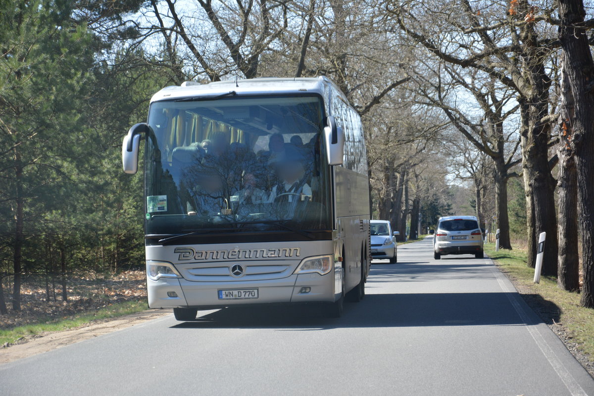 Am 02.04.2016 fährt WN-D 770 in Richtung Tropical Islands. Aufgenommen wurde ein Mercedes Benz Travego / Tropical-Islands-Allee, Krausnick-Groß Wasserburg.