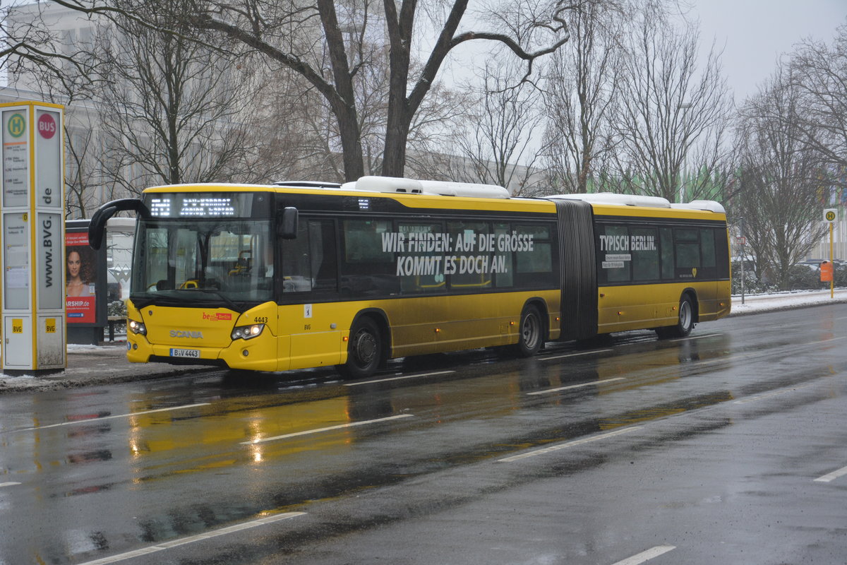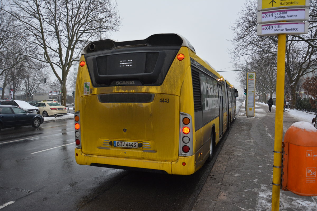 Am 23.01.2016 fährt B-V 4443 (Scania Citywide) auf der Linie M49 zwischen Staaken und Berlin Zoologischer Garten. Aufgenommen an der Haltestelle Masurenallee / ZOB.