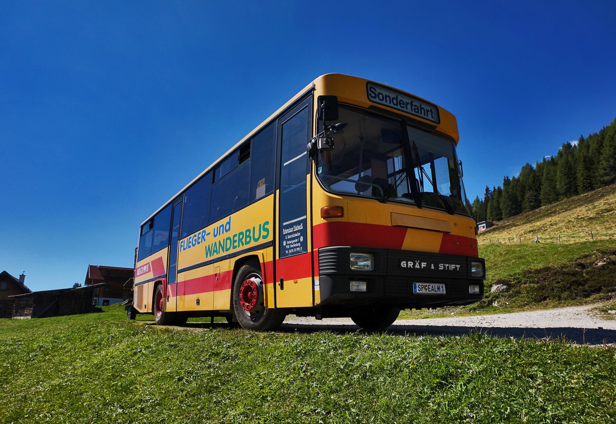 Der Bus war diesen Tag als Flieger- & Wanderbus von Berg im Drautal Adeg über Greifenburg auf die Emberger Alm, zur Dünhofenhütte, unterwegs. Nun wartet er hier, um um 16:30 wieder die Talfahrt anzutreten.