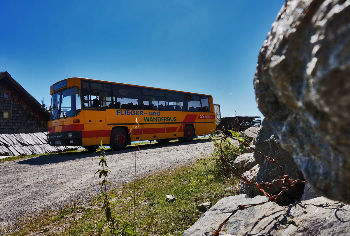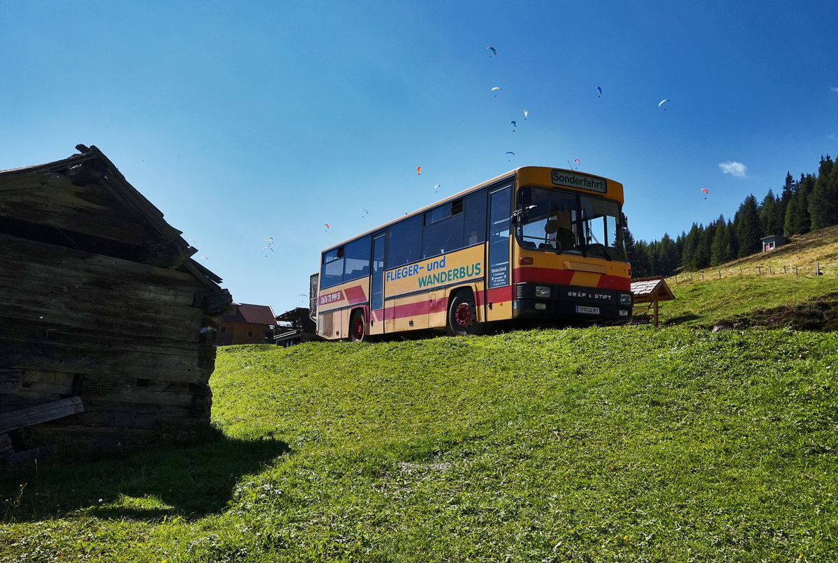Eine Stunde, nach dem die anderen Bilder entstanden, flog passend zum Flieger- & Wanderbus, eine Horde Paragleiter über dem Bus herum.