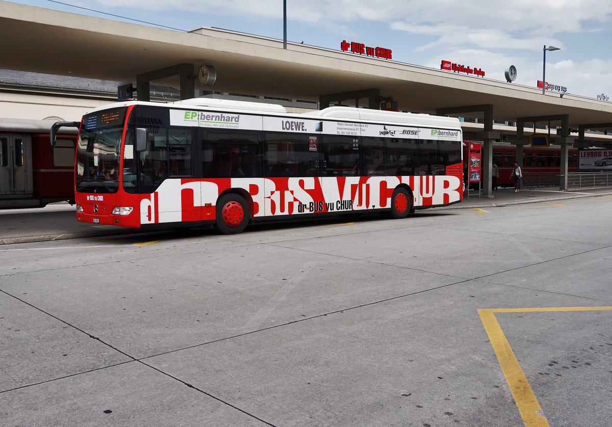 Ein Mercedes-Benz O 530 II der Stadtbus Chur AG, steht als Linie 6 (Chur, Bahnhofplatz - Kleinbruggen) abfahrtbereit an der Haltestelle Chur, Bahnhofplatz.