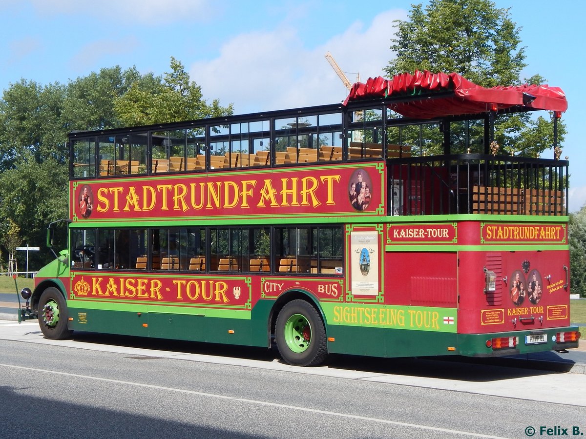 Dieser Mercedes Rundfahrtenbus mit Geschwindigkeitsbeschränkung 20 km/h war am 10.12.2016 mit zwei Anhängern in der Innenstadt von Görlitz unterwegs.