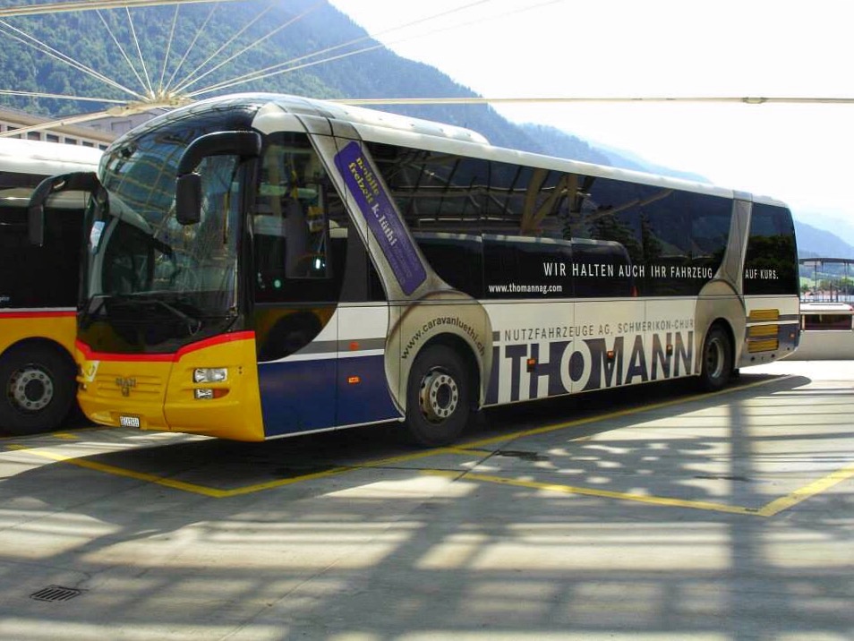 Lion's Regio mit Werbung für Thomann Nutzfahrzeuge AG am 22.6.13 auf dem Postdeck Chur.