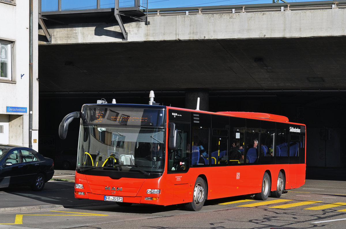 MAN Lions City von Südbadenbus, auf der Linie 38, fährt zur Haltestelle am Wettsteinplatz. Die Aufnahme stammt vom 07.12.2016.