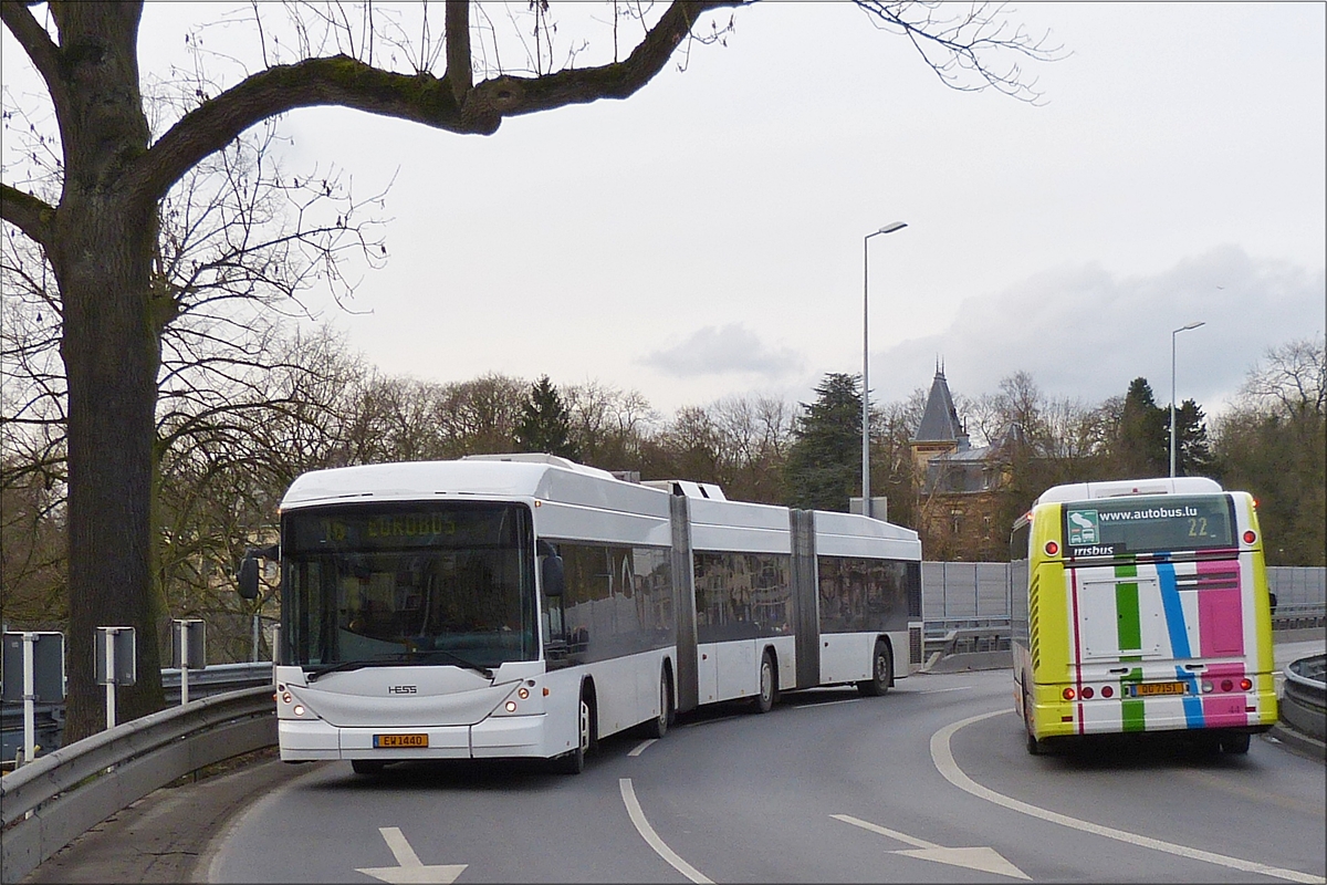 . EW 1440, dieser Hess LighTram Hybrid Doppelgelenkbus fuhr mir am 28.01.16 in der Stadt Luxemburg vor die Linse