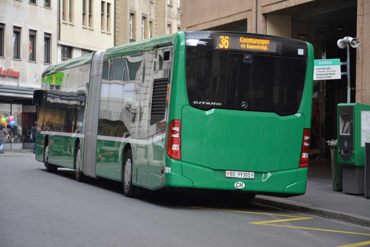 Am 13.10.2015 fährt BS-99301 auf der Linie 36. Aufgenommen wurde ein Mercedes Benz Citaro G der 2. Generation / Basel Schifflände.