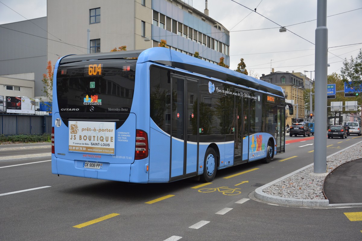 Am 13.10.2015 fährt CK-906-PP auf der Linie 604 nach Saint-Louis. Aufgenommen wurde ein Mercedes Benz Citaro Facelift / Basel Saint-Louis Grenze.