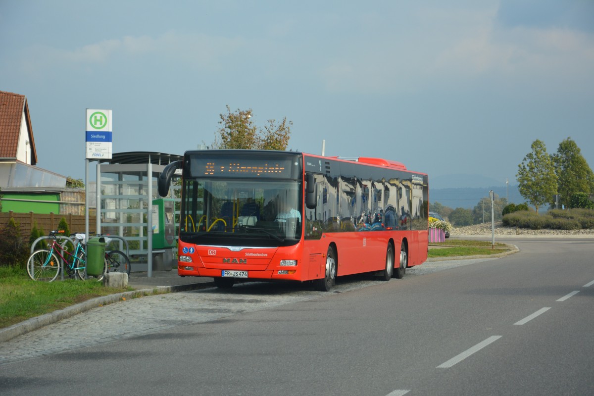 Am 13.10.2015 fährt FR-JS 474 auf der Linie 38 nach Basel Claraplatz. Aufgenommen wurde ein MAN Lion's City L / Wyhlen Siedlung.