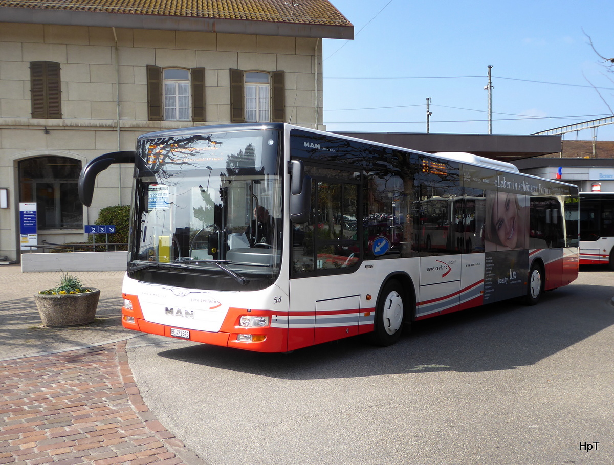 asm Oberaargau - MAN Lion`s City Nr.54 BE 421323 bei der wegfahrt vor dem Bahnhof in Herzogenbuchsee am 22.03.2016