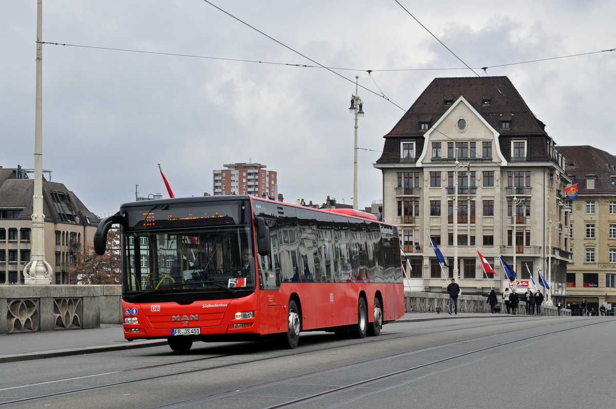 MAN Lions City von Südbadenbus, auf der Linie 38, überquert die Mittlere Rheinbrücke. Die Aufnahme stammt vom 08.03.2016.