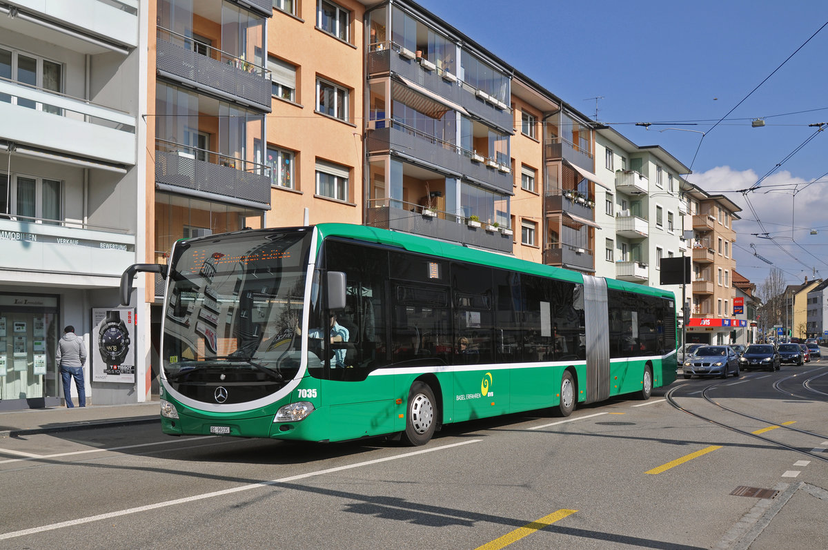 Mercedes Citaro 7035, auf der Linie 34, fährt zur Haltestelle beim Kronenplatz in Binningen. Die Aufnahme stammt vom.26.03.2016.