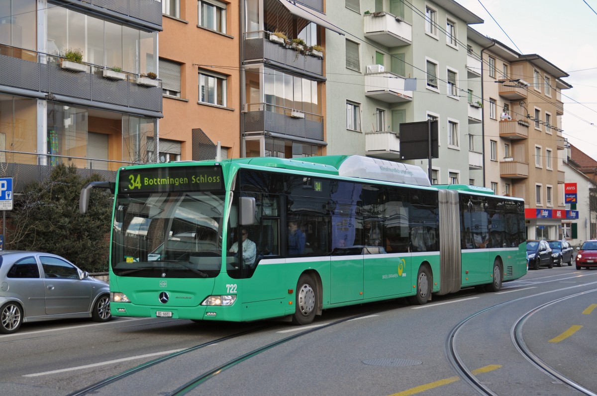 Mercedes Citaro 722 auf der Linie 34 fährt zur Haltestelle beim Kronenplatz in Binningen. Die Aufnahme stammt vom 05.02.2016.