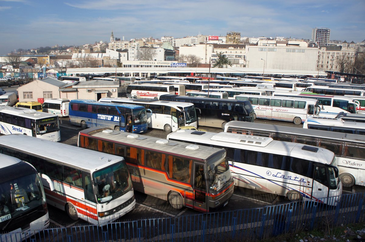 Serbien / Belgrad / Beograd: Blick über die Abstellfläche am Überlandbusbahnhof, aufgenommen im Januar 2016 auf der Brücke über die Save in der Nähe vom Hauptbahnhof Belgrad.